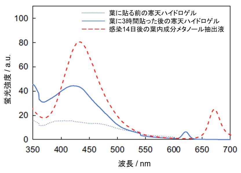 次に、寒天ハイドロゲルによる葉の内部成分の抽出実験を行った。青枯病菌による感染14日後のトマトの葉表面に寒天ハイドロゲル(寒天濃度4 w/v%。2 cm x 2 cm x 1 mmに成形)を3時間貼った後、310 nmの励起波長を照射し、蛍光発光を分光蛍光計により測定した。結果を図3に示す。
