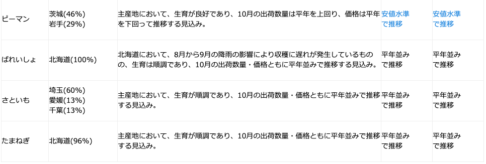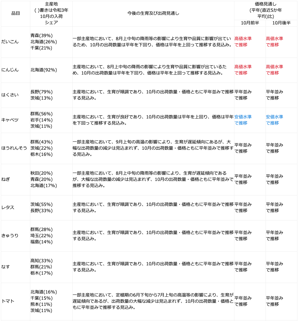 今般、令和4年10月の野菜の生育状況及び価格見通しの聞き取り結果を次のとおり公表する。なお、聞き取りを行った14品目の野菜の生育状況は、東京都中央卸売市場外において流通するものについても、同様の傾向だ。またこれまでの公表資料は次のURLページで公開している( https://www.maff.go.jp/j/seisan/ryutu/yasai_zyukyu/)。