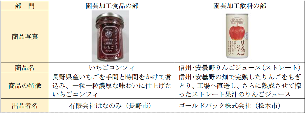 審査員は(一財)食品環境検査協会東京事業所長、(公社)日本缶詰びん詰レトルト食品協会所長ほかだ。主な賞は農林水産大臣賞、農林水産省大臣官房長賞、長野県知事賞ほか。なお、新型コロナウイルス感染症対策のため、関係者のみで開催する。来場時にはマスク着用にご協力お願いしている。