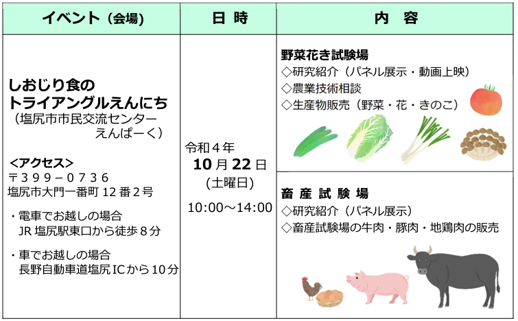 ⻑野県の農業関係試験場では、最前線の試験研究などをご覧いただき、試験場の仕事、農業への理解を深めていただくため、塩尻市等のイベント内で一般公開する。「皆様のご来場をお待ちしています」と関係者は話している。