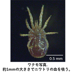 ワクモ(Dermanyssus gallinae)は、鳥の血液を吸って生活しており、しばしば養鶏場で大繁殖するため世界中で問題となっているダニの一種である。ワクモはニワトリにストレスを与え、産卵数の減少を引き起こすなど経済的に大きな影響を与えている。