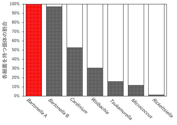 α-プロテオバクテリアに属する細菌で、動物の細胞内に寄生するものも多く存在する。Bartonella属の細菌にはヒトを含む動物に病原性(ネコひっかき病、塹壕熱など)を示す種が知られているが、本研究で特定したワクモに共生するBartonella属細菌は分子系統学的にそれらとは明確に区別されることが分かっている。