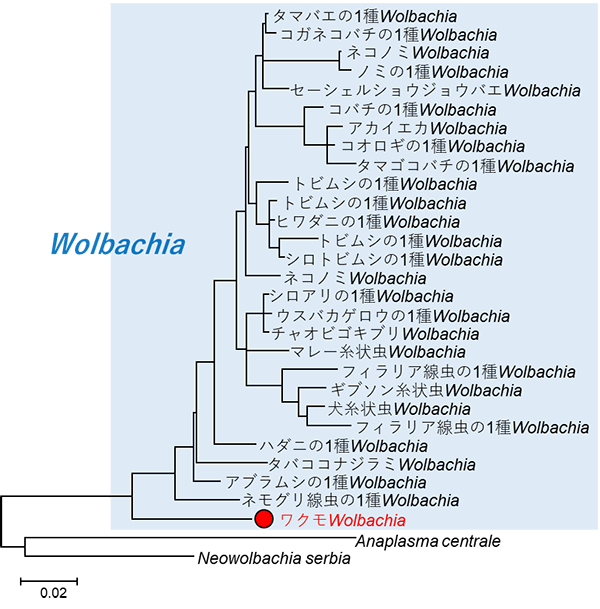 3 昆虫やダニで 二次共生細菌(任意共生細菌) 6)として良く知られるCardiniumやWolbachiaは、北方の北海道や青森、南方の大分や鹿児島からは見つかりませんでしたので、ワクモの生存に必須ではないと考えられた。これらの地域間による共生細菌の違いについては、地点数を増やしたさらなる解析が必要だ。興味深いことに、今回得られたWolbachiaは、これまでに報告されているWolbachiaとは異なる、新たな系統であることも判明した( 図2)。