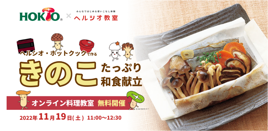 シャープ(株)とホクト(株)がコラボし、「秋にうれしい、きのこたっぷり和食献立」をテーマにオンラインでヘルシオやホットクックを使い、きのこを使った和ごはんの実演•実習や、きのこについてのお話をする。