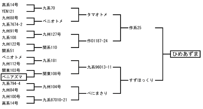 1「ひめあずま」は、カロテンを含み病害虫抵抗性に優れる「作系25」を母、やや粉質の肉質で食味に優れる「すずほっくり」を父とする交配組合せから選抜した。「ひめあずま」は「ベニアズマ」の子孫にあた る(図1)。