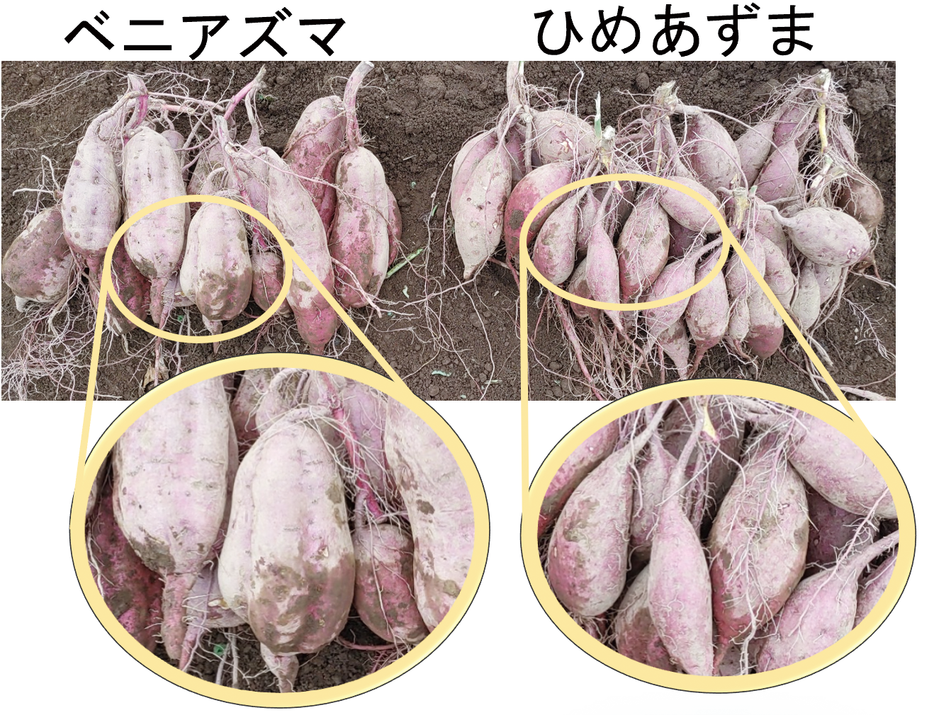 「ひめあずま」は「ベニアズマ」より条溝や凹凸が少なく、形状のそろいが良い。