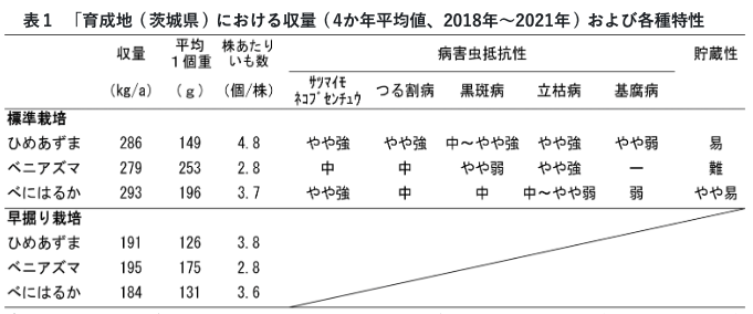 表1「育成地(茨城県)における収量(4か年平均値、2018年~2021年)および各種特性