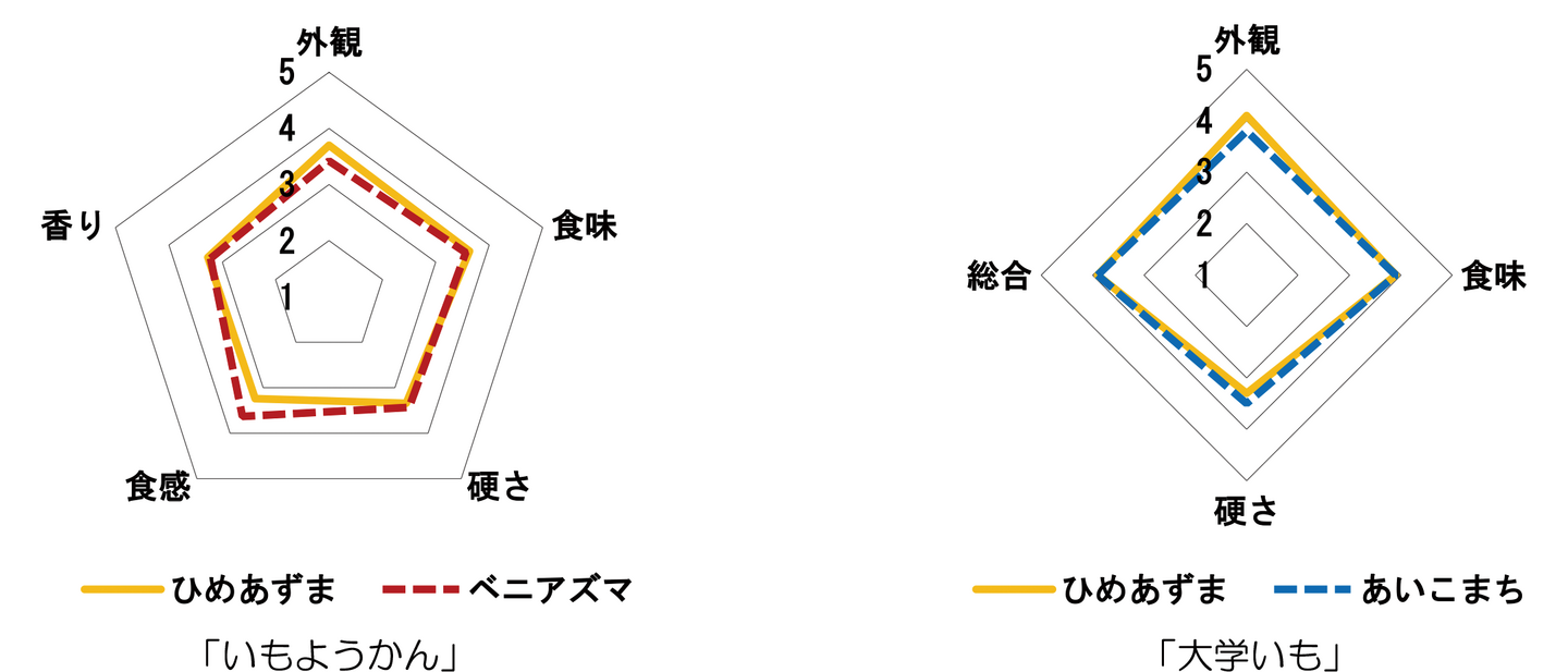 5「ひめあずま」の肉色は"黄"、肉質は"やや粉"、食味は"やや上" だ(表2)。実需者による品質評価では、「ひめあずま」は「ベニアズマ」に近い香り、食味、硬さであり、いもようかんや大学いもへの加工に適してい る(図4)。