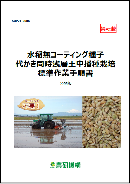 標準作業手順書には、技術の特徴や導入条件、必要な機械、栽培上のポイントのほか、導入事例や導入効果、導入した際に生じやすい問題点と対策についても記載した。本標準作業手順書の公開により、経営規模拡大により苗を育てるビニルハウスが足りない、移植や収穫作業の時期が集中して困っている、あるいは育苗•移植の省力化を図りたいなどの理由で直播栽培技術の導入を新たにお考えの方や、これまでの直播栽培をより省力化したい方への普及拡大が期待される。【標準作業手順書掲載URL】水稲無コーティング種子代かき同時浅層土中播種