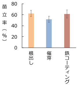 そこで5mm以内の浅い土中に播種できる「代かき同時浅層土中播種機」( 写真1、(株)石井製作所より販売中)を、(株)石井製作所、山形大学と共同で開発した。さらに苗立ちをより安定させるため、出芽がよい「根出し種子」(根だけを少し伸ばした種子)技術を開発し( 写真2)、鉄コーティング種子を使用した場合と同程度の苗立ちを実現した( 図1)。