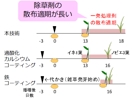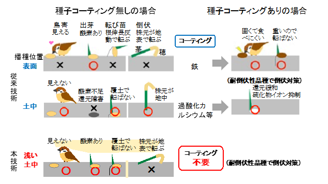 1)栽培では 苗立ち 2)をよくするために種子に鉄粉等をコーティングする 種子コーティング 3)が一般的だが、コスト、手間、技術が必要などの問題点があった。