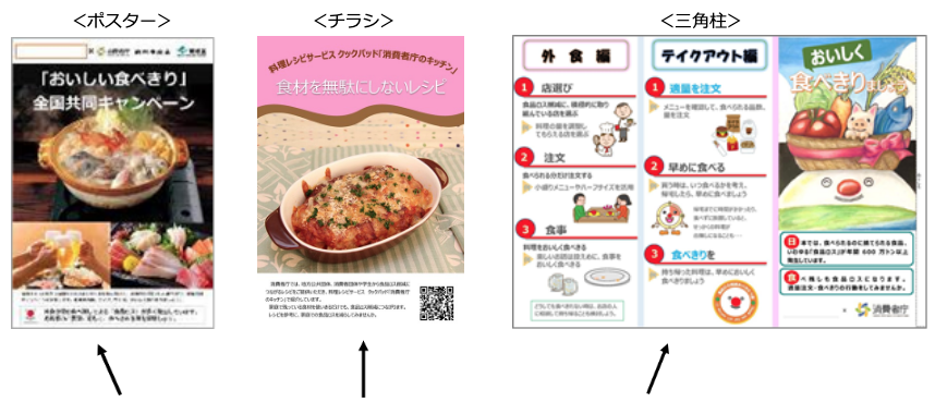 外食事業者等が消費者に残さず食べきることを呼びかけるために、店舗で使える卓上ポップ及びポスターを提供している。これらは以下のURLからダウンロードできる(農林水産省)。