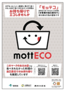 持ち帰りの啓発としては、飲食店や自治体の皆様が御利用いただける、飲食店で食べ残してしまったものを持ち帰る「mottECO」の普及啓発資材も提供している(環境省)。