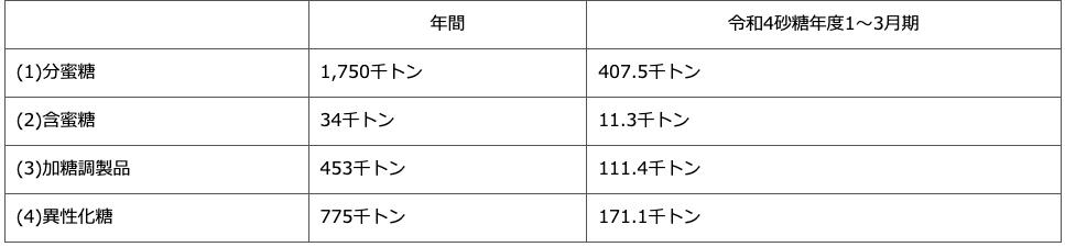 注2)分蜜糖とはさとうきび、てん菜を原料とする糖汁を結晶化し、糖蜜を分離させた物で、上白糖、グラニュー糖などがある。