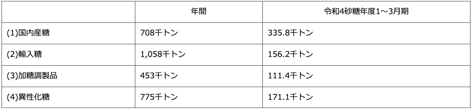 注4)分蜜糖、国内産糖及び輸入糖は精糖ベース、含蜜糖は製品ベースである。