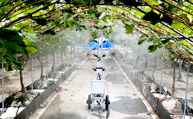 FARBOTに搭載するスプレーヤ機構には静電ノズルを採用、飛散性、付着性に優れている。動力噴霧機併用のホース牽引タイプで薬剤を汲みに行く手間なく連続で作業を行える。スプレーヤの高さは上下に可変、どのノズルから散布するかも選べるので作物の成長に併せて散布範囲を変更出来る。FARBOTの操作同様に散布のON/OFFはリモートコントローラーで行え、離れた場所から操作を行うことで農薬被曝の心配も大幅に削減される。オプションでセンシング機能の追加も可能だ。同社の検証試験では従来の手散布作業に比べて30%以上の作業時間短縮、20%の農薬使用量の低減が見られた。