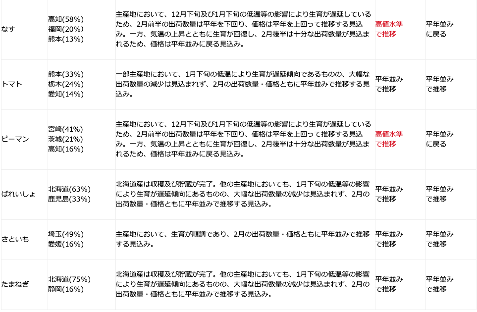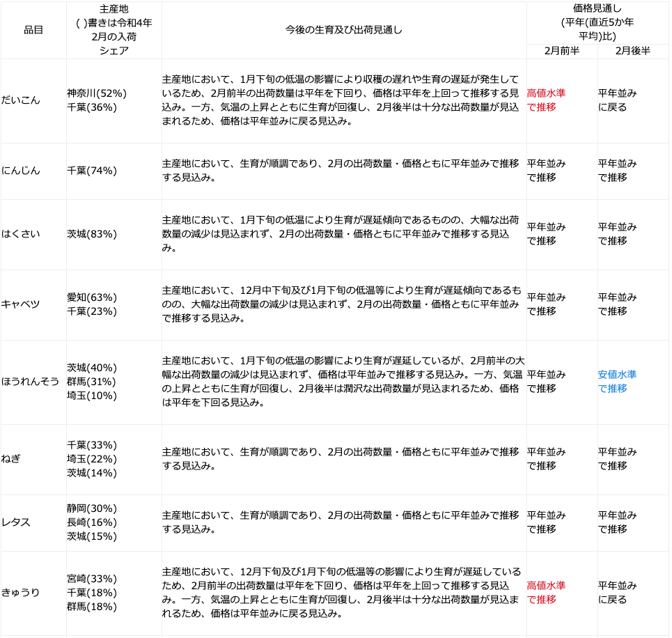 今般、令和5年2月の野菜の生育状況及び価格見通しの聞き取り結果を次のとおり公表している。なお、聞き取りを行った14品目の野菜の生育状況は、東京都中央卸売市場外において流通するものについても同様の傾向だ。また、これまでの公表資料は次のURLページで公開している。