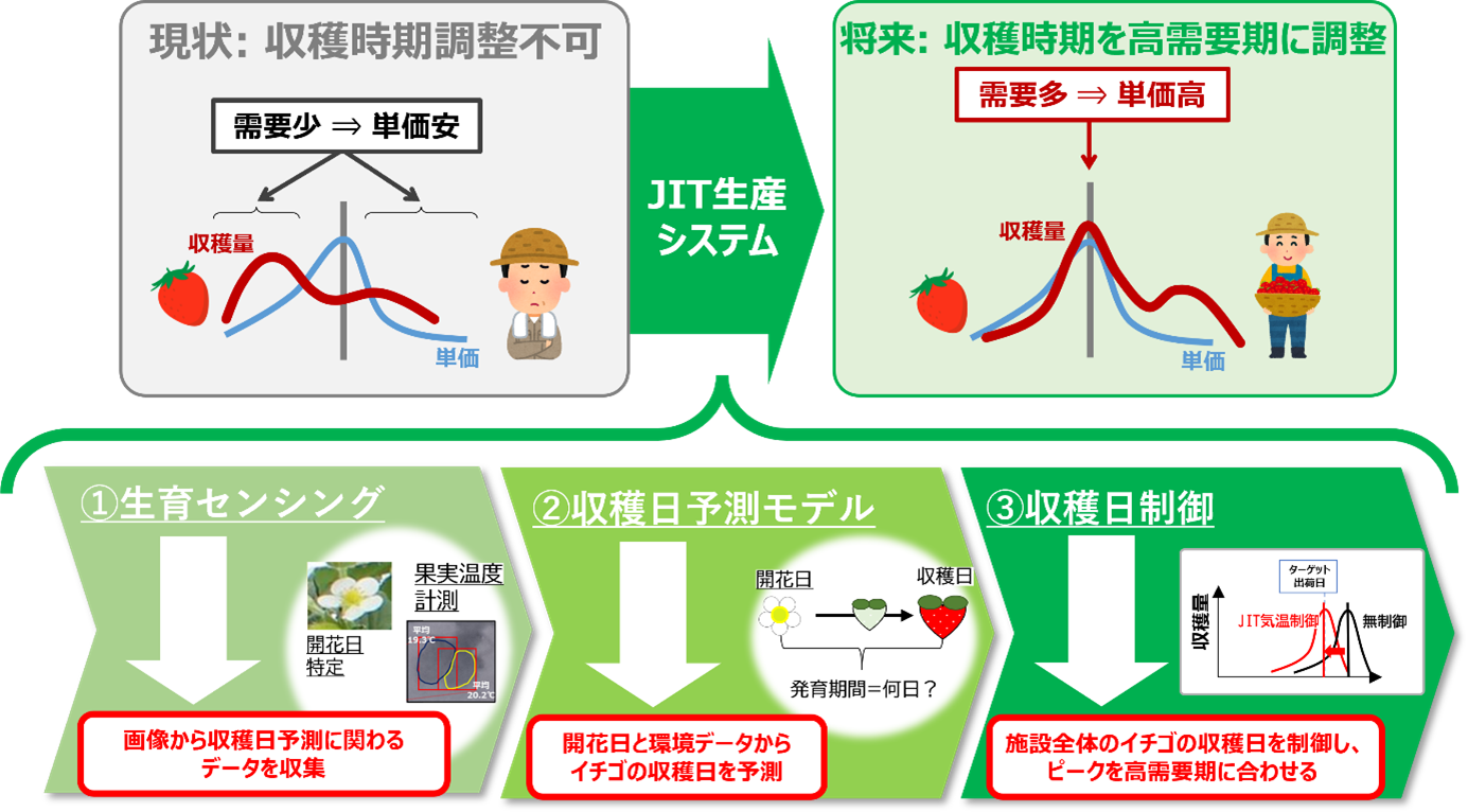現在開発中のイチゴJIT生産システムは、需要動向を踏まえて高精度で収穫時期を調整し、計画的な出荷を行う生産技術だ。JIT生産システムは、ロボティクスの考え方に基づく3つの要素技術(生育センシング、収穫日予測モデル、収穫日制御技術)を組み合わせることで、収穫時期の調整を実現する( 図1)。
