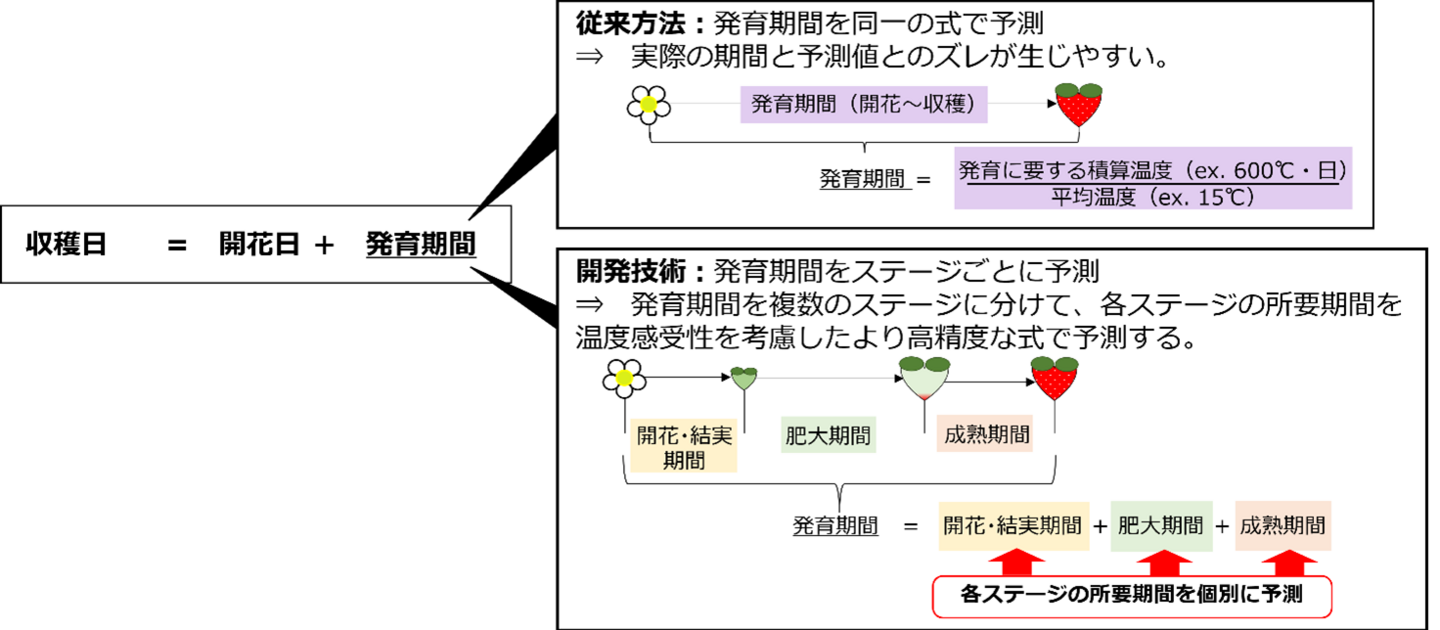 今回、開発した収穫日予測モデルは、開花から収穫までの期間を複数のステージに分割して細かく予測する( 図2)。従来の方法では開花から収穫までの日数を単一の式(例. 積算温度600°C日)で予測していたが、果実の発育ステージで温度の影響が異なるという知見が反映されておらず、実際の収穫日と予測日が解離する問題があった。本モデルではステージごとに最適な式で予測することで、収穫約1か月前の開花時点から収穫日を予測できることを人工気象室で確認した。更に本モデルと前述の果実温度計測技術により、日射等の影響で温度等の偏りが大きいハウス内における収穫日の高精度予測が期待される。