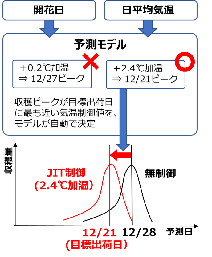 上記の収穫日予測モデルにより、開花以降のハウス内気温を調節することで、収穫日の制御が可能。従来は精密な温度管理による収穫日制御は行われていないか、あるいは生産者が経験的に温度を制御していた。今回開発した収穫日制御技術は、開発した予測モデルで推定した調査果の収穫日から、ハウス全体の日別収穫果数を予測する。そして、気温制御値と収穫果数を網羅的にシミュレーションし、収穫ピークが目標出荷日に近接するように、モデルが自動で気温制御値を決定する( 図3)。