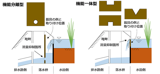 器具は水田水管理用のせき板とは別に田んぼダム機能を備えた器具を取り付ける機能分離型(以下、「分離型」と記す)と、通常の水田水管理用のせき板に田んぼダム機能を付与した機能一体型(以下、「一体型」と記す)の2つのタイプに大きく分けられる(参考文献4)。それぞれ設置方法が異なり、また効果や水田への影響等に特徴がある。