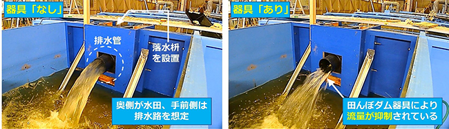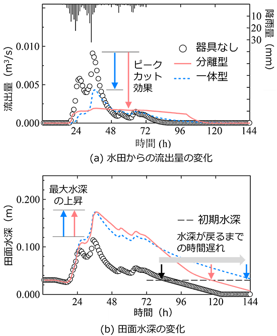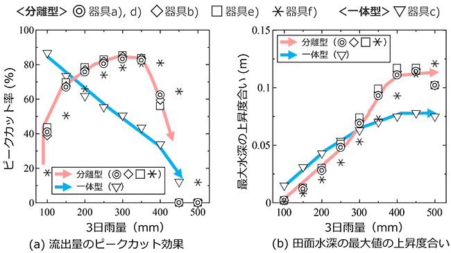 水田の排水口に取り付ける田んぼダム用器具は、大きく分けるとせき板のように設置するタイプ(機能一体型)と、せき板とは別に設置するタイプ(機能分離型)があり、前者は比較的小さな雨に、後者は300mm程度のまとまった雨に対して、より効果を発揮する傾向がある。また、水田の水深の変化については、前者の方が雨の直後から上がりやすく、いったん上がった後は元の水深に戻るまで時間を要す。なお、400mm以上の大雨では、いずれの器具とも雨水の一時的な貯留による流出を遅らせる効果は低下する。