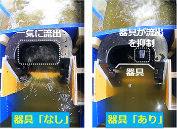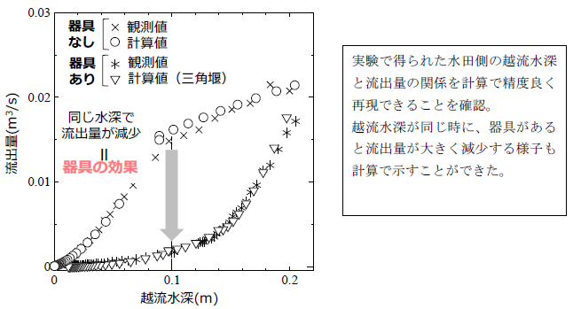 器具がある場合とない場合で実験中の様子を比較すると(図3、図2の器具b)の例、上流側の水深は同じ)、器具がある場合では流出量のピークが大きく減少し、流出が抑制されている様子がよくわかる。各器具による流出の特徴を再現するために、流量計算式(セキの公式、オリフィスの公式など)を用い、パラメータとなる流量係数を当てはめたところ、実験結果である観測値を計算式によって良く再現できることが確認できた(図4)。水田の水深(図4の横軸)が同じときに、器具がある場合は、器具がない場合に比べて大きく流出量が減少している。
