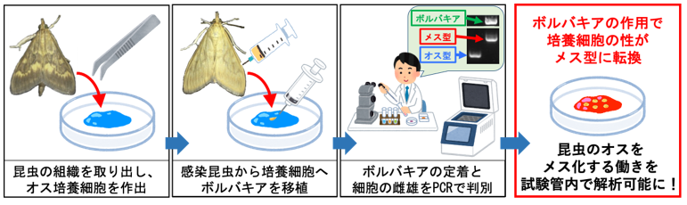 農研機構は富山大学、東京大学、摂南大学と共同で、チョウ目害虫アズキノメイガのオス宿主由来の培養細胞を作出し、これにボルバキアを人為的に移植し、定着させることに成功した。また見た目ではわからない培養細胞の性をPCR検査により簡易的に調べる手法を確立した。