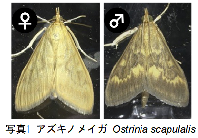 1.チョウ目害虫アズキノメイガ(写真1)に感染する共生微生物ボルバキアは宿主の性をオスからメスへ性転換させることが知られている。アズキノメイガの雌雄は遺伝子の発現調節で決まる。性決定遺伝子doublesex(Osdsx)は雌雄で異なる発現パターンを示すため、PCR検査により雌雄判定できる(Sugimoto and Ishikawa, 2012; https://doi.org/10.1098/rsbl.2011.1114)。