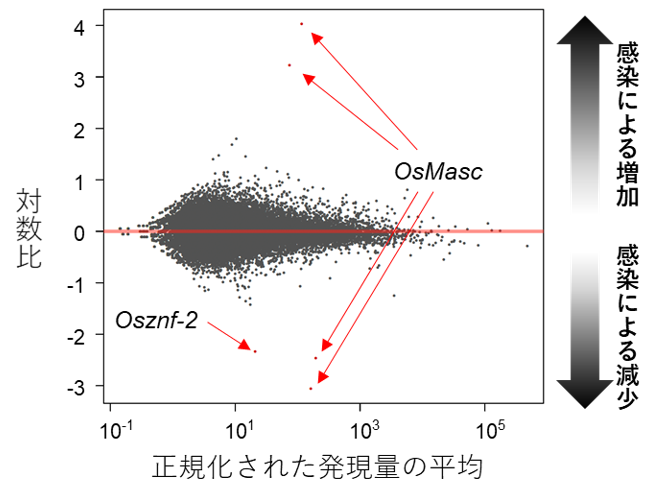 非感染オス細胞に対する感染オス細胞における56,026個の遺伝子断片のRNA量(対数比)。遺伝子断片5つのみが有意な発現変動を示した(赤丸)。このうち4つがOsMasc、1つがOsznf-2の部分配列に相当した。
