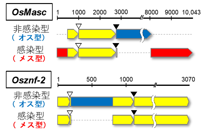 図2 OsMascおよびOsznf-2の遺伝子構造(cDNA)