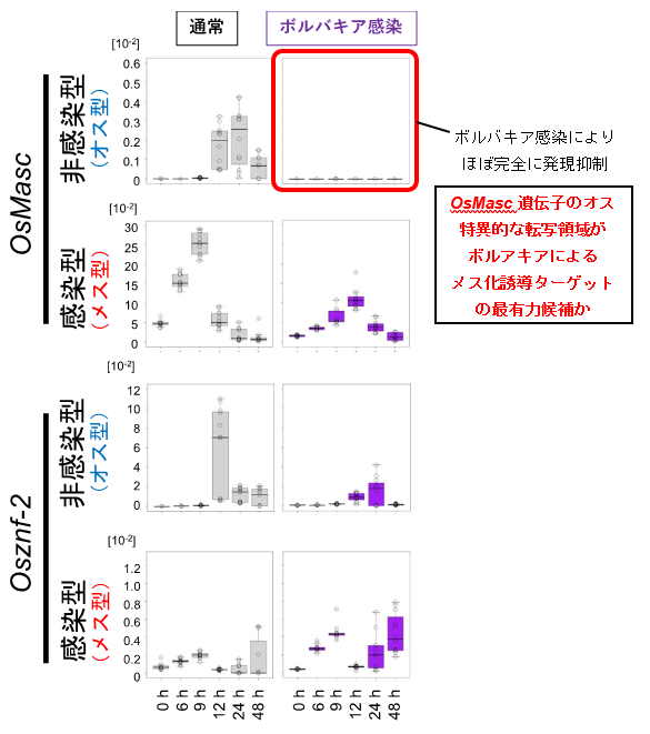 4.アズキノメイガ卵の発生初期において、OsMascとOsznf-2の2種の遺伝子の発現パターンを解析したところ、OsMasc遺伝子のオス型配列のみがボルバキアにより顕著に抑制されることがわかった( 図3)。この結果はOsMascのオス特異的に転写される領域がオス化決定に重要な配列であり、ボルバキアによるメス化誘導のターゲットである可能性を示唆する。