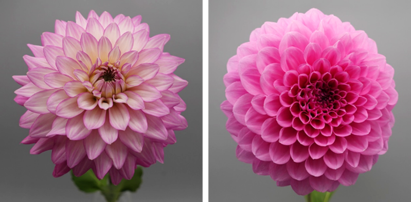 この度、そのエターニティシリーズに新たな特性でバリエーションを拡大した、良日持ち性でかつ美しい複色花色の「エターニティピーチ」、良日持ち性でかつ落弁しにくく流通適性に優れる「エターニティシャイン」の2品種を育成し( 図1)、下記の通り種苗生産のための原種苗提供の予約を開始した。新品種は早生で生産性にも優れ、切り花としてのダリアの一層の全国普及が期待される。