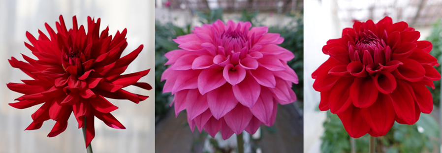 農研機構では、2014年からダリアの日持ち性を向上させる育種研究に取り組み、2020年に日持ち性に優れるダリア3品種、暗赤色の「エターニティトーチ」、濃桃色の「エターニティロマンス」、深赤色の「エターニティルージュ」を育成した( 図2)。