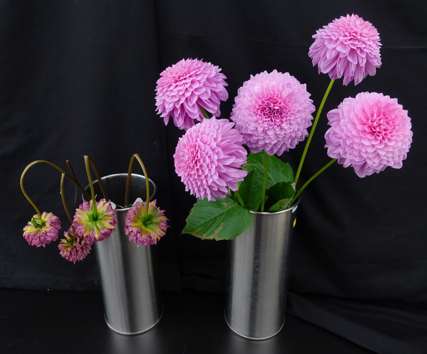 茎長60cmの切り花を品質保持剤GLA液1.5L入りの銀筒に生け、23°C、相対湿度70%、12時間日長条件で10日目((発送2023.2.8.到着2.10.品質保持剤入りの立箱で湿式輸送、クール便)。