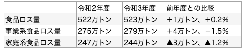 令和3年度の食品ロス量推計値は523万トンとなり、前年度より1万トン増加した。このうち、食品関連事業者から発生する事業系食品ロス量及び一般家庭から発生する家庭系食品ロス量の内訳は下表のとおりだ。食品ロスについて