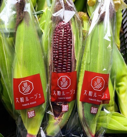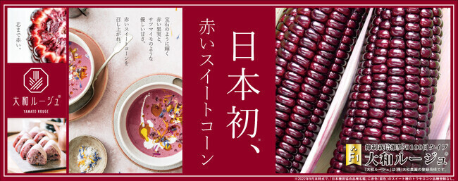 日本初*となる「赤色」のスイートコーンで、奈良で100年以上、野菜の種子を研究開発している種苗メーカーの(株)大和農園(本社奈良県天理市、吉田睦代表取締役社長)が開発し、2022年10月中旬より全国で種子の販売を開始した。同社社長は種苗業界では数少ない女性社長で、女性的な感性を活かし、大和ルージュのブランディングを行った。*2022年9月末時点で「日本種苗協会品種名鑑」に赤色(紫色)のスイート種のトウモロコシ品種登録なし。