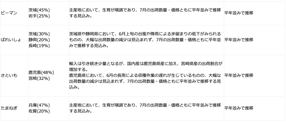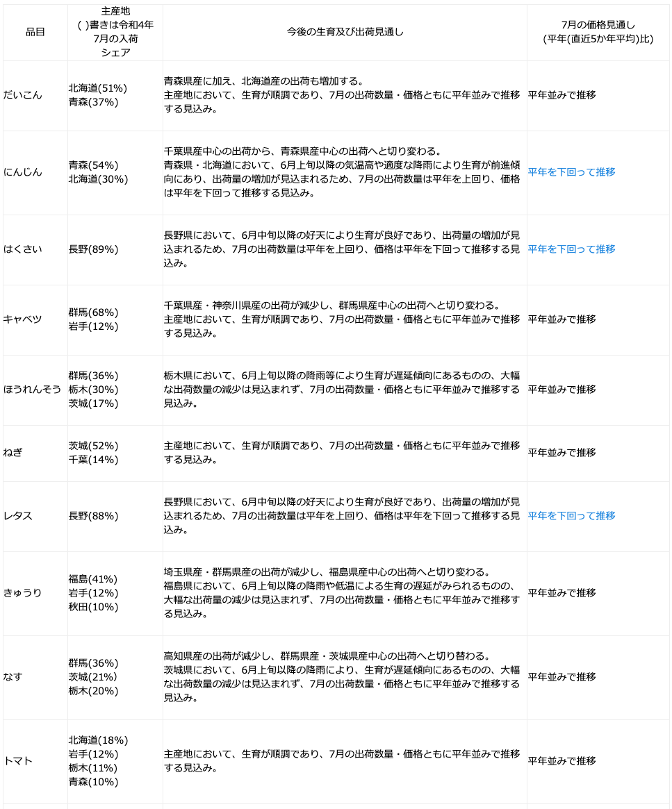 農林水産省は、東京都中央卸売市場に出荷される野菜の生育状況及び価格見通し(令和5年7月)について、主産地等からの聞き取りを行い公表している。