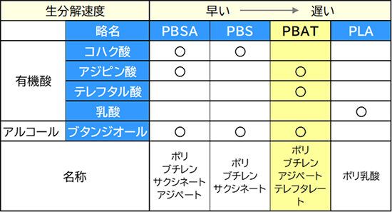生分解性プラスチックは、分別回収や再生利用が難しい農業や土木など屋外での用途や、食品包装や衛生用品などへの利用が期待されている。農業用マルチフィルムなど一定の耐久性が必要な製品には、使用中に意図しない分解を抑えるために、分解が比較的遅いPBATを混合した製品が多く作られている。