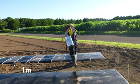 図1 市販の生分解性マルチフィルムへのPaE散布処理試験の様子