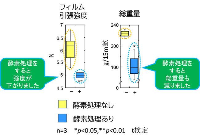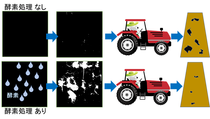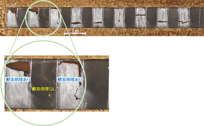 これらの生分解性プラスチック素材を混合した市販の生分解性マルチフィルムも、PaE溶液に浸すと分解された。畑の畝に展張した市販の生分解性マルチフィルムの表面にPaE溶液を散布する処理方法でも、翌日にフィルムの強度が下がった。また畑に鋤き込んだ後すぐに、土の中や表面から目視で回収できたフィルム断片は、酵素処理をしなかった場合に比べて大きな断片が減り、総重量も減少した。生産現場においても、酵素処理によってフィルムの分解が加速されることを明らかにした。