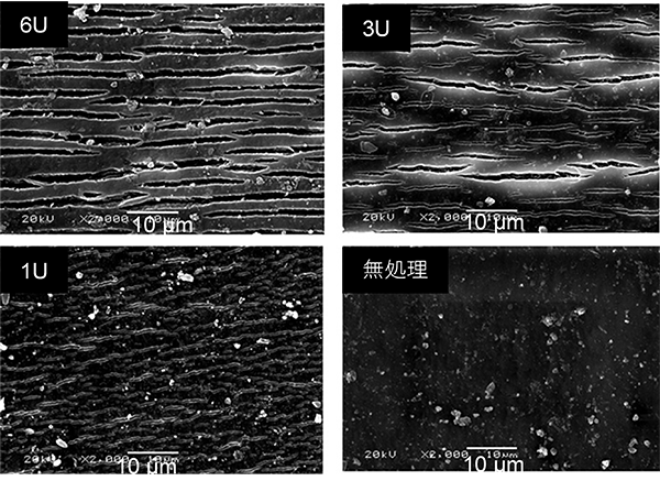 図3 散布処理翌日(24時間後)のマルチフィルムの表面。散布処理に使用したPaEの濃度(ユニットUで表示)が高いほどマルチフィルム表面にミクロレベルで亀裂が生じる。ユニット(U)は酵素の力価を示す。ここでは生分解性プラスチックPBSAエマルジョンの660nmにおける吸光度を1下げる酵素の量を1Uとしている。
