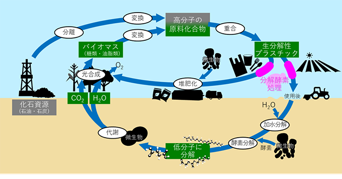 図6 バイオマス原料由来の生分解性プラスチックと分解酵素を組み合わせたプラスチックの循環利用