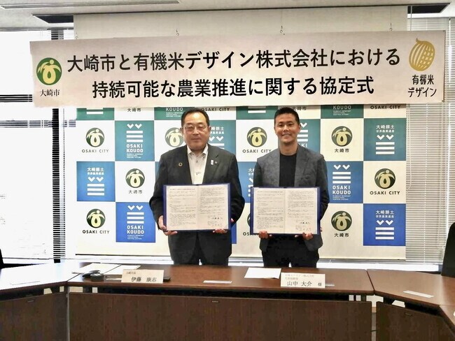 田んぼの自動抑草ロボットの開発で有機米市場の拡大に取り組む有機米デザイン(株)(本社東京都小金井市、山中大介代表取締役)は、この度、世界農業遺産「大崎耕土」(平成29年認定)の豊かな自然環境を維持しながら将来にわたって持続可能な農業を地域に定着させるべく、グリーンな栽培推進に取り組む宮城県大崎市(伊藤康志市長)と、「大崎耕土」における持続可能な農業の普及拡大、及び地域社会の発展に資することを目的にとして、本日8月10日、『持続可能な農業推進に関する協定』を締結した。
