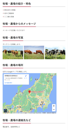 畜産農家•牧場ごとに1ページを割り当て、簡易的なホームページとすることで、畜産農家•牧場の名刺代わり•宣伝•採用などに活用いただける。