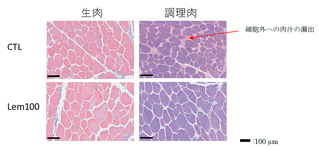 ・構造的な変化:肉を加熱調理すると、タンパク質が収縮し、肉質が硬化することが知られている。本研究の染色試験では、CTL群において加熱調理後に筋細胞の収縮および細胞外への肉汁漏出が認められた(図1)。一方、Lem100群ではこれらの現象が緩和されており(図1)、加熱調理時に起こる肉の構造変化が抑制されていることを示している。