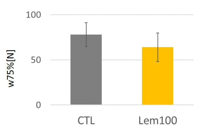 ・物性の変化:スライス肉サンプルを圧縮した際にかかる荷重は、CTL群と比べてLem100群の方が小さいため(図2)、Lem100群はCTL群よりも小さな力で破断することが明らかとなり、軟化に影響があると認められた。