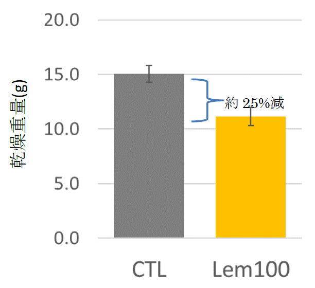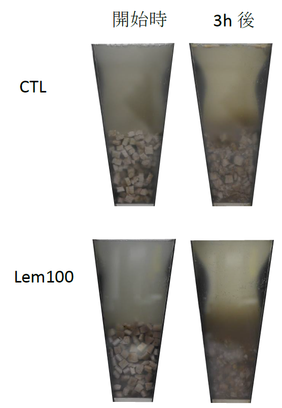 ・胃消化性:各サンプル(60g)を用いてGDSでの消化試験を行い、開始3時間後に胃消化物をふるい分けした。ヒトの体内では胃消化物は十二指腸以降でさらに消化され、胃から十二指腸へ向かって次第に細くなる管状の幽門部を通過する必要がある。そのため幽門部を通過できない大きさの胃消化物は十二指腸へ移行しにくく、消化が進まないもの(未消化と定義)ということになる。胃の出口である幽門よりも大きいふるいの網目(2.36mm、3.35mmを使用)を使用してCTL群と比較した際、Lem100群では未消化分が約25%減少(乾燥重量ベース)していた(図3)。これはLem100群の方がより消化されたことを示している。