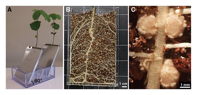 (A)「リゾフレーム」は透明なアクリルでできた薄い箱型の栽培装置。「リゾフレーム」に土をつめて植物を植え、金属のケースにいれて遮光し、アクリル面に根を露出させるよう60度傾けて栽培する。(B)金属ケースを外し、アクリル板越しに根や根粒が成長する様子を土から掘り起こすことなく観察できる。(C)「リゾフレーム」で栽培したダイズの根に形成された根粒。