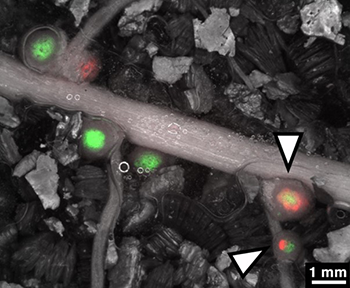 赤色(tdTomato)または緑色(ZsGreen)の蛍光タンパク質を発現するダイズ根粒菌を混合してダイズに接種することで、2つの菌が土壌中で競合して植物に感染する様子を観察することができた。矢尻(△)の根粒内部には緑と赤の蛍光が観察され、1つの根粒に2種類の根粒菌が同時に共生していることがわかった。